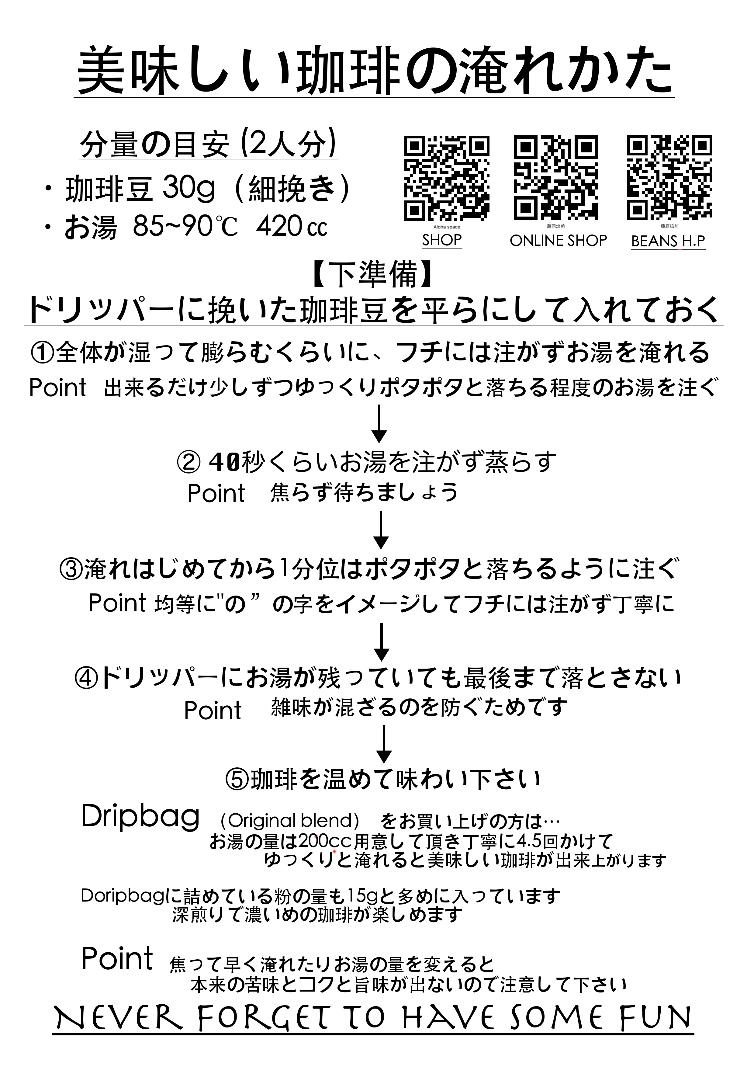 私は珈琲の器具や拘りや好みや淹れ方や誰と何処で飲むかなどは人それぞれだと思いますなので当店の淹れかたも参考として下さいお湯の温度も80〜85度前後で淹れたらまろやかな雑味を感じにくいものになったりと様々な方法があります一概に決まりはございませんただ、当店の珈琲豆であなたのCoffee時間の隙間に入らせて頂く為日々良いものをと研究、向上させて頂いております貴方の中の珈琲になれますようにと…